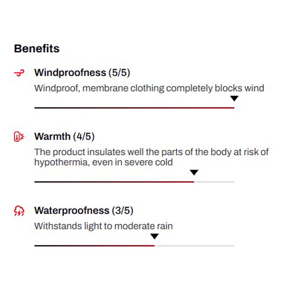Thanks to synthetic insulation with properties similar to down, it effectively retains heat even in bad weather. The outer material is equipped with an ecological DWR treatment without PFC substances and a membrane with parameters of 10,000 mm H₂O / 10,000 g/m²/24 h.