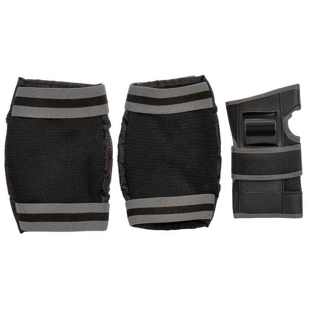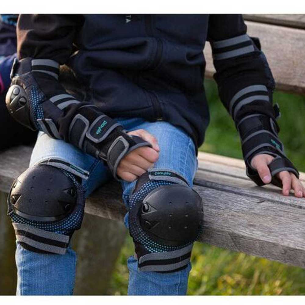 Διαθέτει σκληρά και μεγάλου μεγέθους καλύμματα στο γόνατο και τους αγκώνες που ασφαλίζουν με ιμάντες επάνω και κάτω από αυτά για μέγιστη ασφάλεια, με υλικά αφρού EVA υψηλής ποιότητας που απορροφούν τέλεια την κρούση. Αυτό το σετ προστασίας είναι ανατομικά σχεδιασμένο για να ταιριάζει όμορφα και άνετα και να παραμένει με ασφάλεια στη θέση του. Τα περικάρπια είναι σαν νάρθηκες παρέχοντας την καλύτερη δυνατή προστασία του καρπού στα παιδιά.