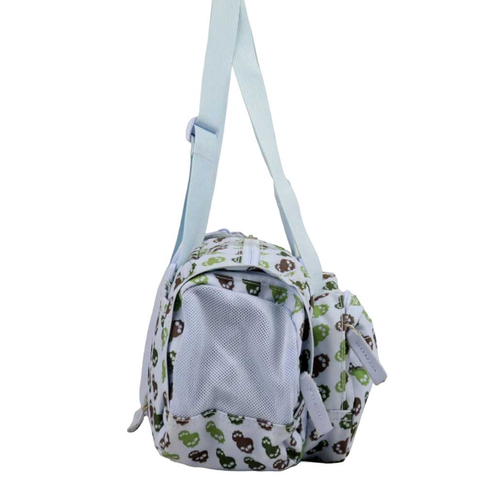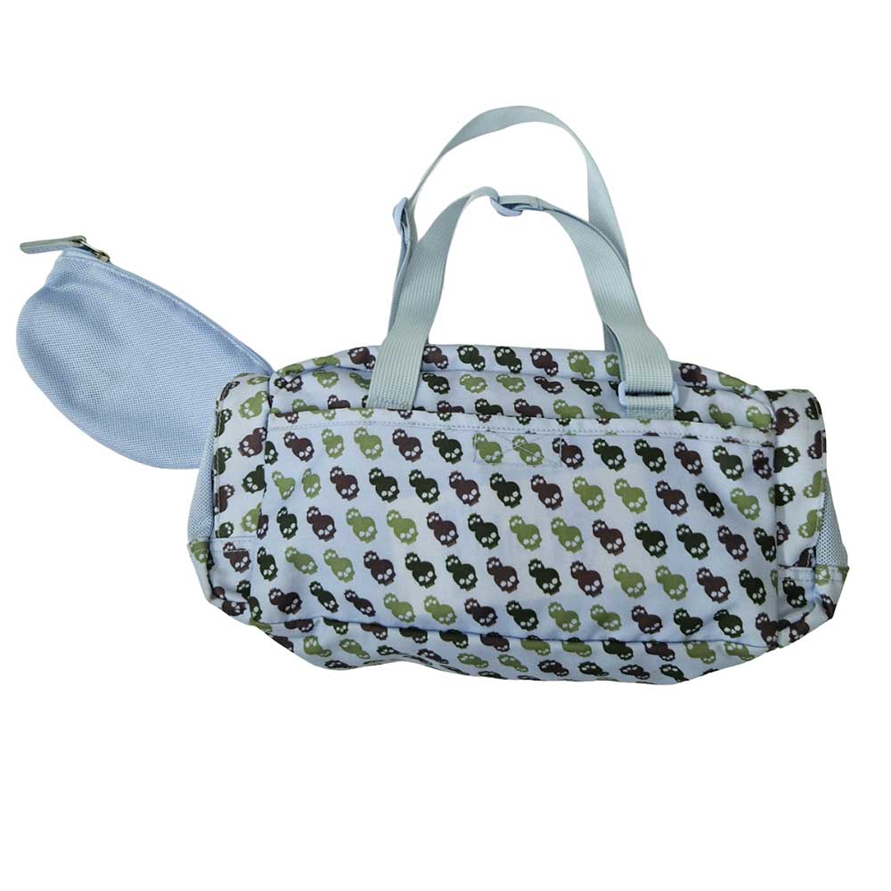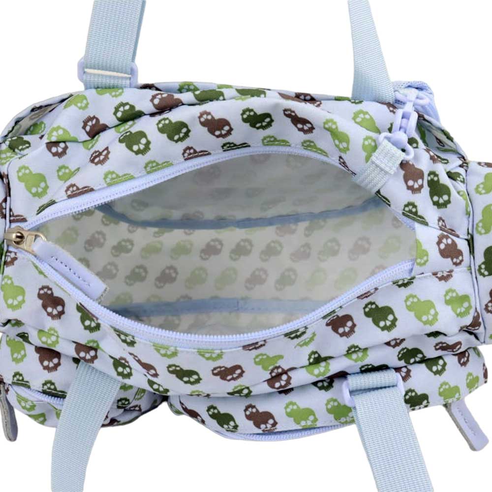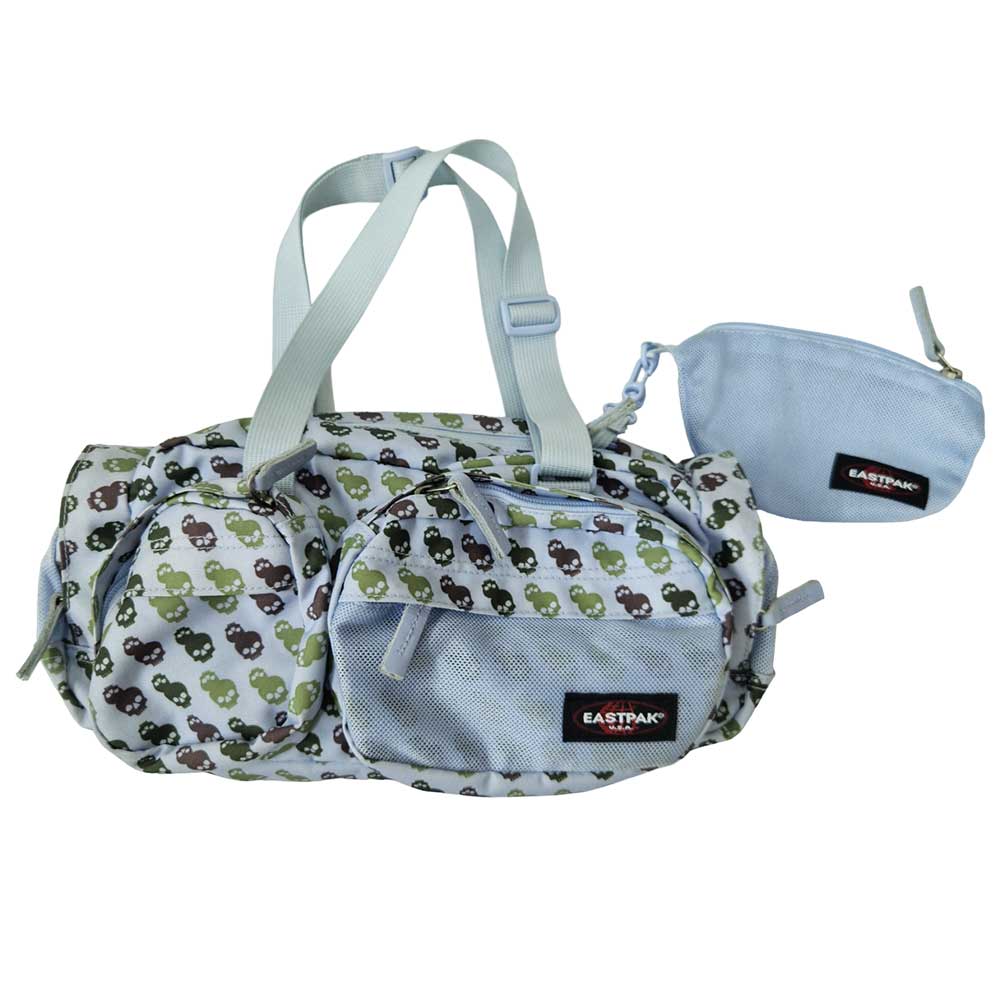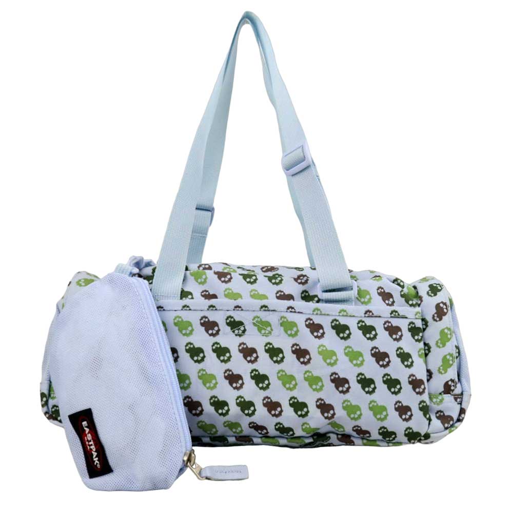 Αυτή η τσάντα της Eastpak με τον εύκαμπτο και πολύ ανθεκτικό καμβά της έχει μπλε ανοιχτό χρώμα με μοτίβο τα κρανία. Το μακρύ σχήμα της είναι ιδανικό για την αποθήκευση των αντικειμένων σας. Στην εξωτερική της πλευρά υπάρχουν τέσσερις μεγάλες τσέπες που κλείνουν με φερμουάρ, δύο επίπεδες τσέπες, μία ανοιχτή και μία με velvro και μια τελική επίπεδη τσέπη με φερμουάρ. Η κύρια θήκη της, που κλείνει με φερμουάρ, έχει ένα αφαιρούμενο διχτυωτό τσαντάκι με φερμουάρ που πιάνεται εσωτερικά με καραμπίνερ. Έχει δύο ρυθμιζόμενες σε μήκος λαβές για μεταφορά στους ώμους ή στο χέρι.